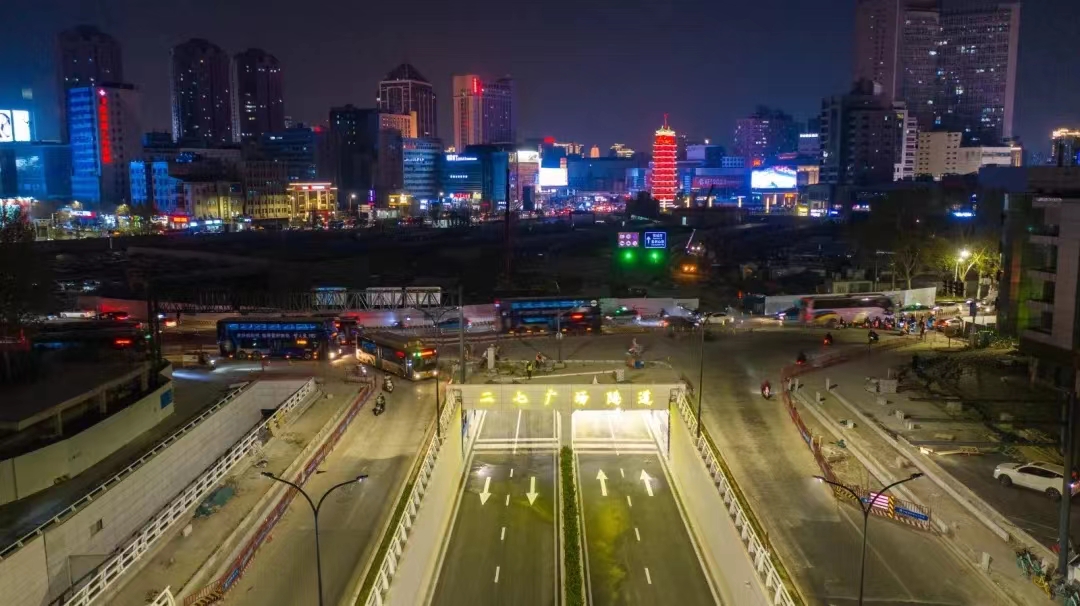 郑州二七广场隧道位于二七核心区重要交通咽喉,主线隧道由西向东依次上跨地铁一号线隧道、德华地下商业街、地铁三号线隧道,是目前郑州市最难开挖的隧道。隧道总长1370米,投资6.2亿,于2020年10月16日开工建设,2023年3月11日11点正式通车,历时2年。
