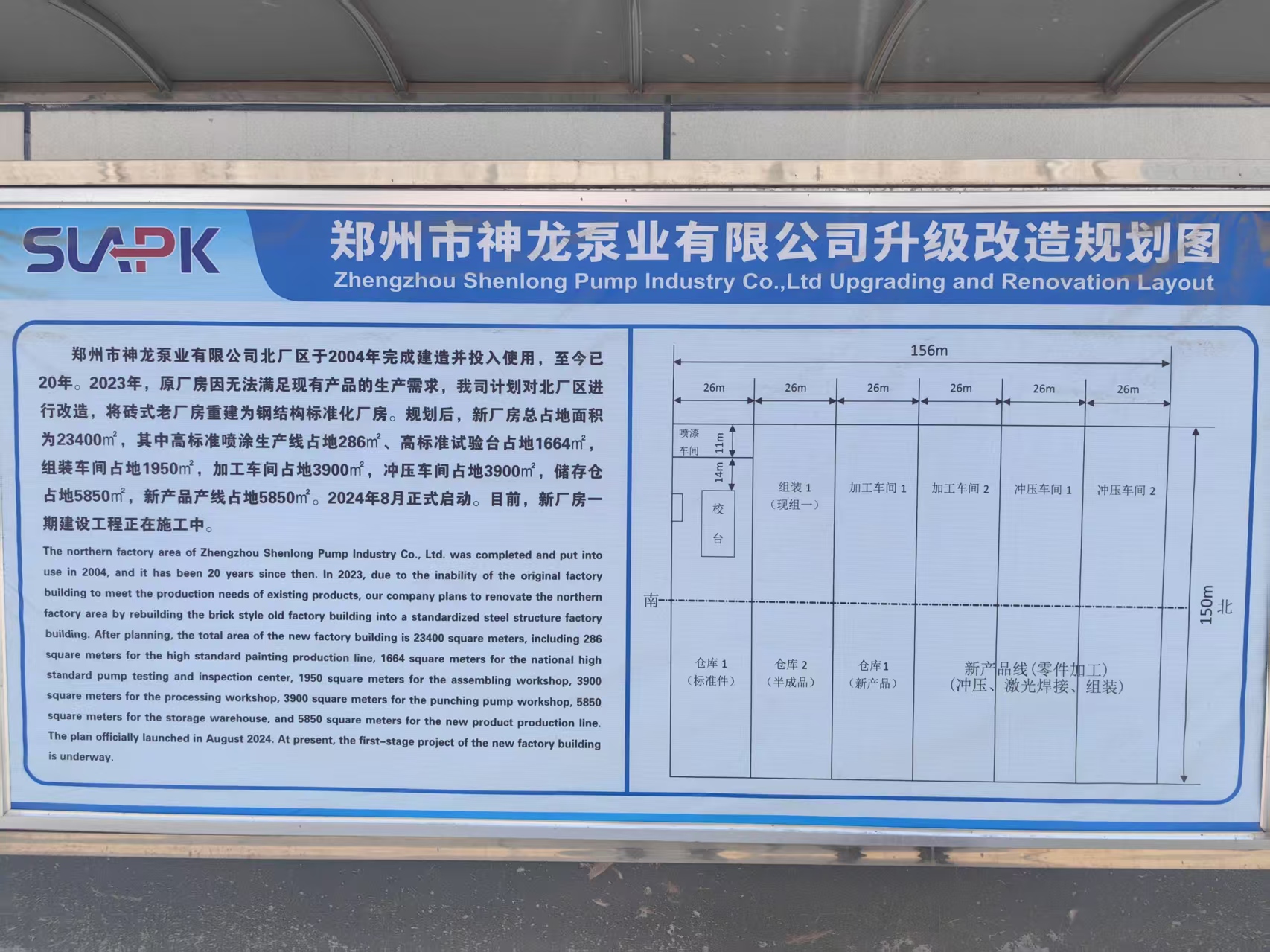 华体会体育北厂区于2004年完成建造并投入使用,至今已20年。2023年,原厂房因无法满足现有产品的生产需求,我司计划对北厂区进行改造,将砖式老厂房重建为钢结构标准化厂房。规划后,新厂房总占地面积为23400㎡,其中高标准喷涂生产线占地286㎡、高标准试验台占地1664㎡组装车间占地1950㎡,加工车间占地3900㎡,冲压车间占地3900㎡,储存仓占地5850㎡,新产品产线占地5850㎡。2024年8月正式启动。目前,新厂房一期建设工程正在施工中。