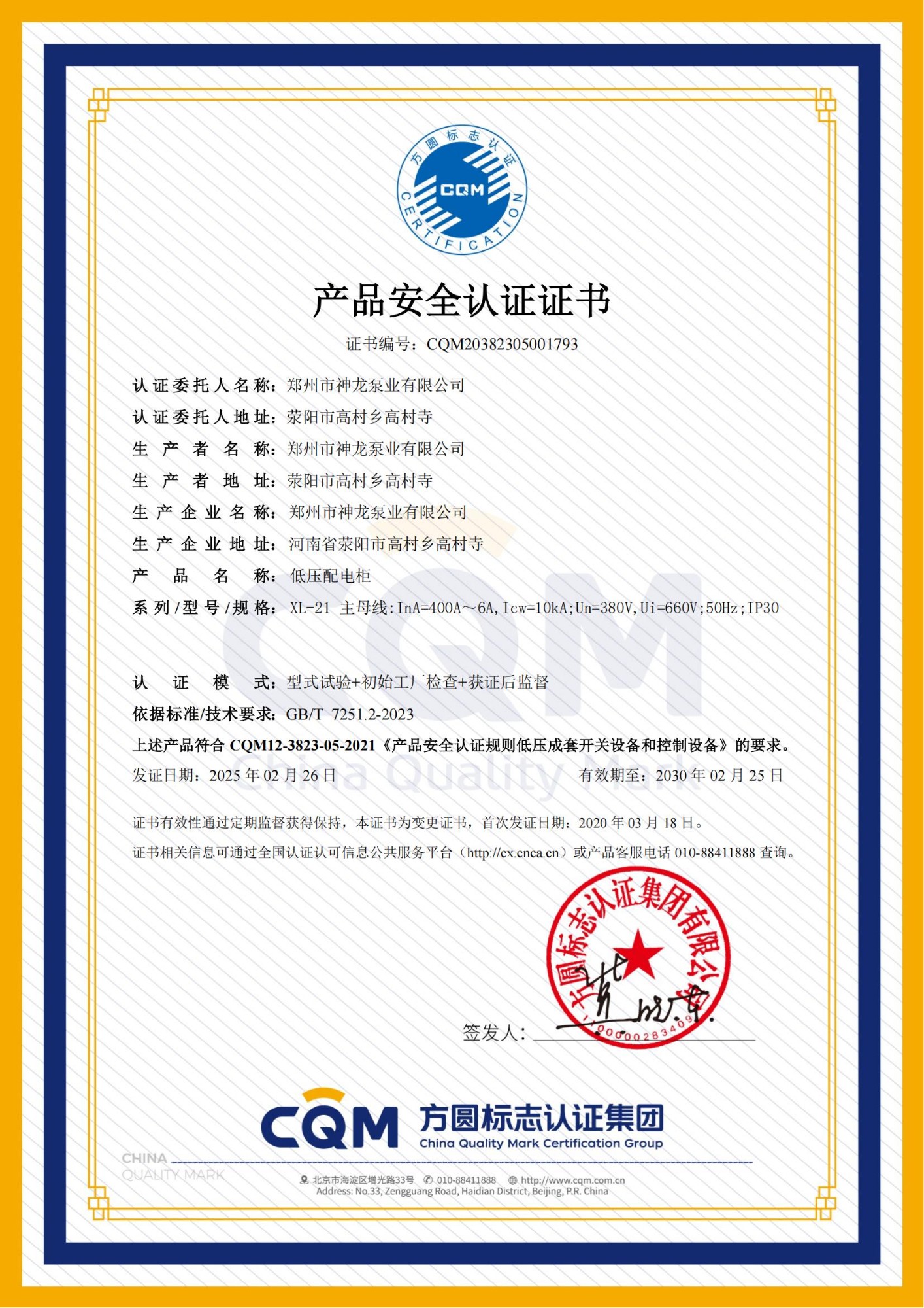 低压配电柜产品认证证书